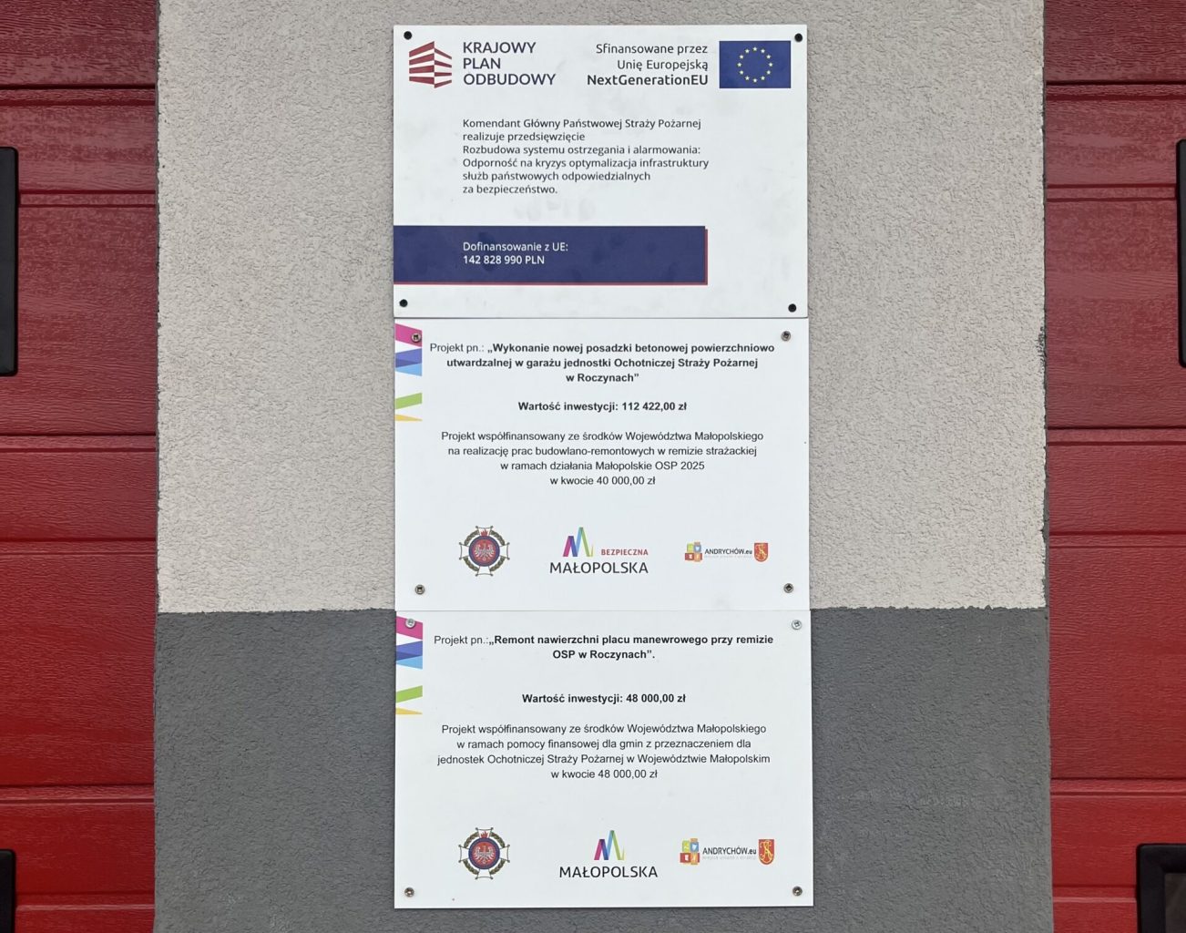 15 stycznia 2026 roku w naszej remizie miało miejsce oficjalne przekazanie nowej posadzki w garażach. Remont posadzki odbył się w ramach projektu „Małopolskie OSP 2025” – część A. Inwestycja to kolejny krok w kierunku poprawieniu bezpieczeństwa oraz komfortu pracy. Koszt inwestycji został pokryty ze budżetu Województwa Małopolskiego, Gminy Andrychów oraz środków własnych.